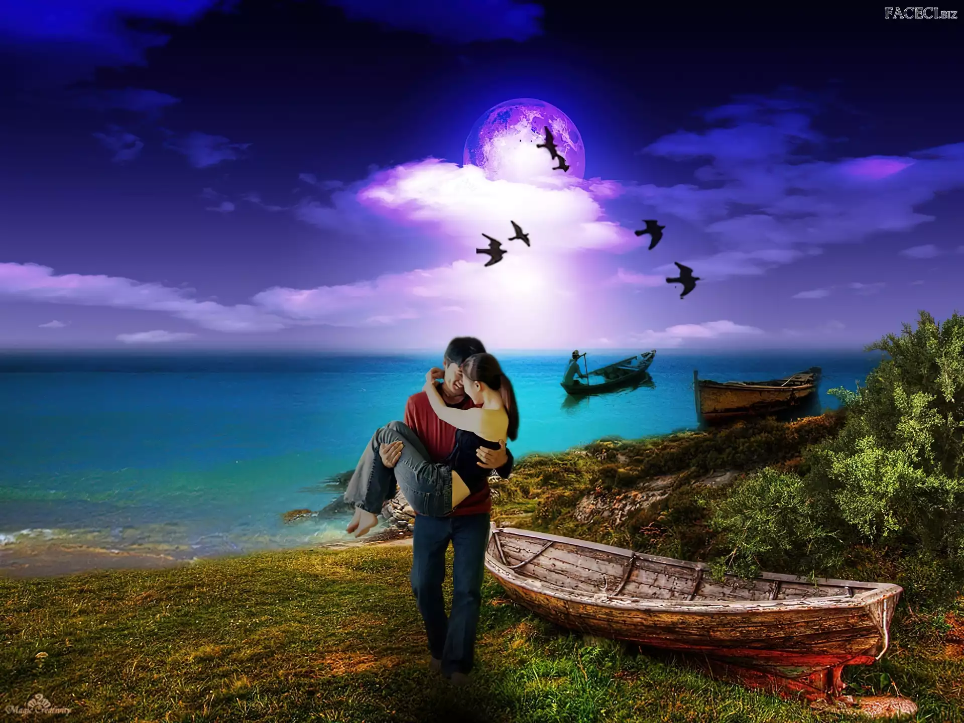 Łódki, Kobieta, Chmury, Ptaki, Mężczyzna, Morze - faceci.biz