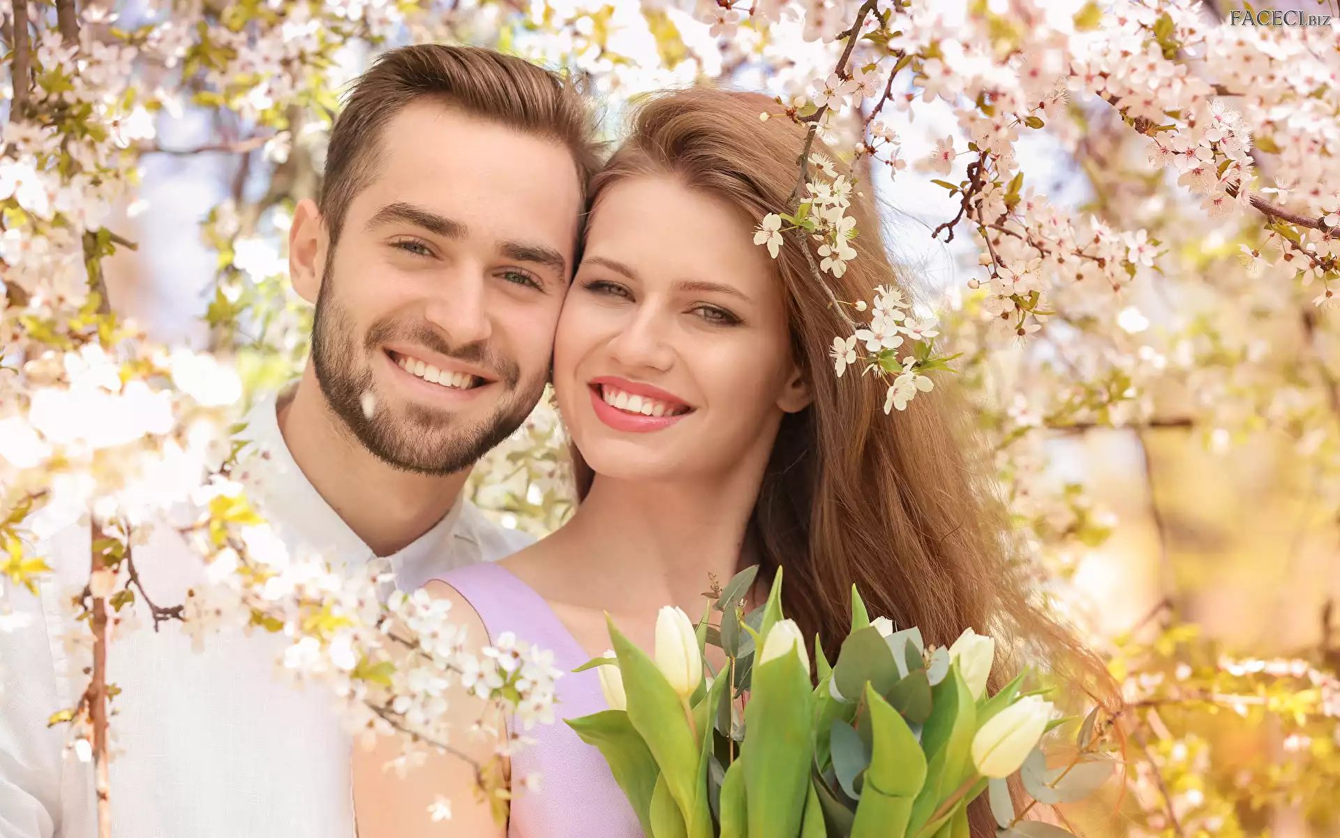 Tulipany, Uśmiechnięta, Kobieta, Drzewa owocowe, Kwiaty, Mężczyzna, Para - faceci.biz